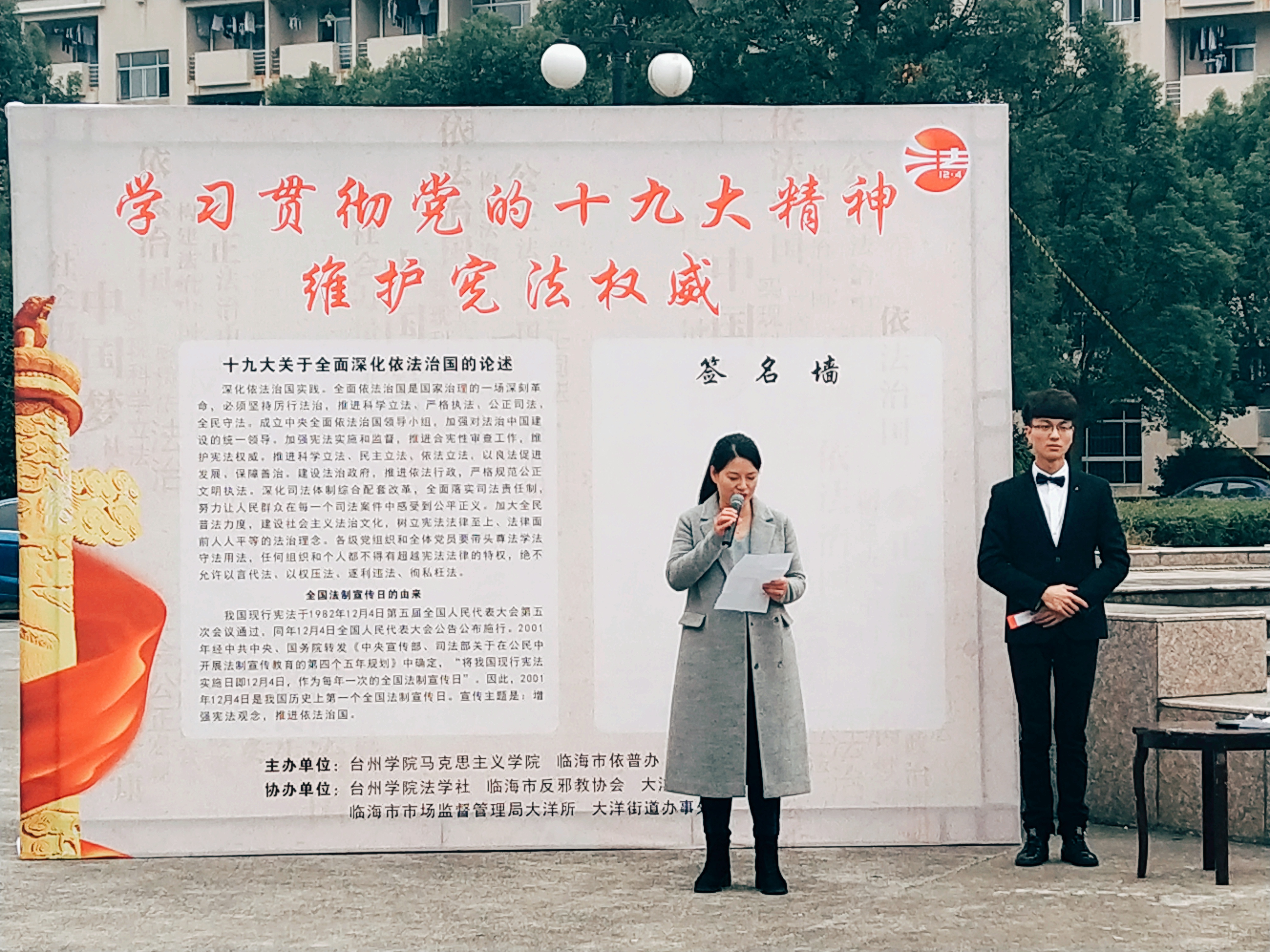 为了学习贯彻党的十九大精神,深入学习宣传宪法;同时为了让法制走进校园,进一步增强同学们的法制意识,做一个知法、守法的合格学生。2017年12月7日台州学院马克思主义学院、临海市依法办、临海市司法局协同台州学院法学社、临海市反邪教协会、大洋司法所、临海市市场监督管理局大洋所、大洋街道办事处联合举办了本次法律校园行活动。