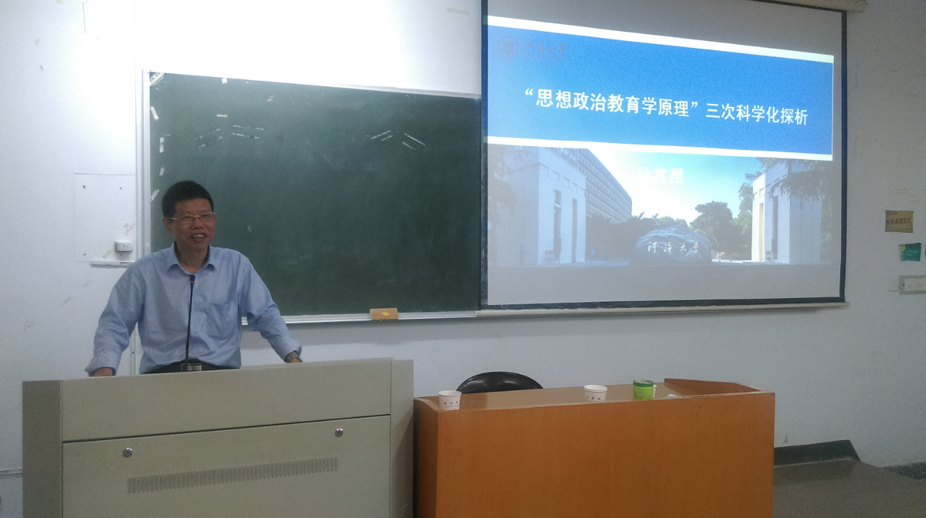 本次讲座中,孙教授主要围绕“思想政治教育三次科学化”、“思想政治教育科学化再定位”、“思想政治教育科学突破举措”三方面展开。他指出,思想政治教育学原理是思想政治教育的核心内容,不管是从形态、主体还是层次来看,其在整个思想政治教育系统中都起着基础性作用。思想政治教育原理的三次科学化有着各自阶段鲜明的特点。从线索演化来看,经历了从政治工作,到思想政治工作概论,再到思想政治教育学原理三个结果限域。从思想政治教育原理的功能定位、形态定位、目标定位分析来看,推进思想政治教育原理科学化,是思想政治教育科学化和思想政治教育学科化的重要组成部分,对于思想政治教育专业建设具有知识生命基础的意义。从实践的视域来看,要突破思想政治教育原理科学化,必须准确把握思想政治教育学原理的特点:即科学性是其第一属性、独特性是其专有特征、逻辑性是其阶段特征、积累是其发展规律、实践性是其基础、动力和标准。他最后指出,思想政治教育学原理概念很小,空间很大,勉励大家要做到“共识、攻关、积累、发展”。