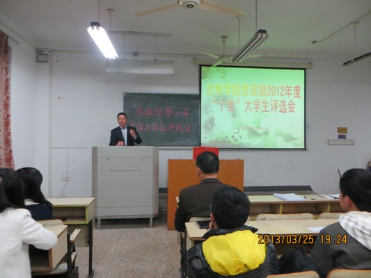3月25日18时,思政部在3201教室举办思政部2012年度十佳大学生评选会。思政部党总支书记杜才平、副主任林伟及学院相关老师出席评选会,各班级学生代表及团学会成员组成大众评审团参加评比活动。