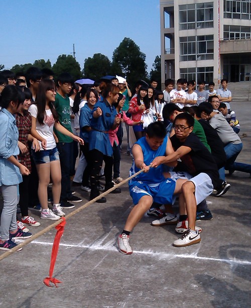 赛前,队员们神色紧张,紧紧盯着绳子。随着裁判员的一声哨响,两边队员们手交叉着手,整齐一致往后仰,握住麻绳,紧咬牙关,犹如装上发条一般。女队员们一改风范,团结一致;男队员一展风采,众志成城。他们齐心协力,为荣誉而战,为集体而战。学院老师则在一旁热情地为同学们出谋划策,加油鼓劲;啦啦队的呐喊助威声响彻赛场,现场氛围高涨,比赛精彩纷呈、异常激烈。