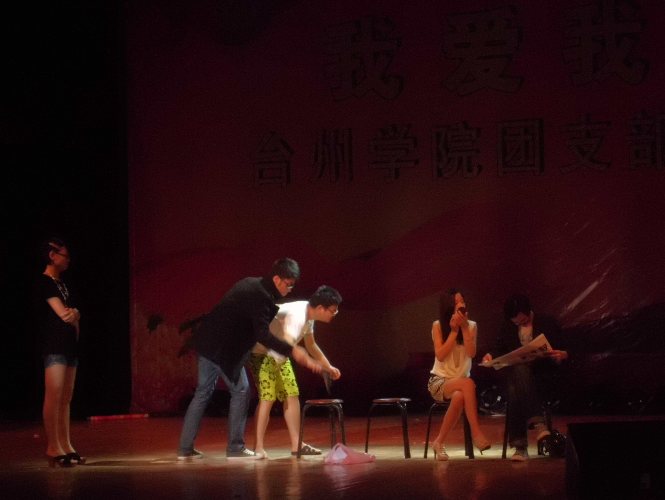 由10历史思政团支部练振、吕小龙、沈丹、张秀秀、王侃、黄亮、胡涛、张建晓等同学主演的哑剧《一颗钉子》巧妙地设计围绕一颗公交座椅上的钉子而引发产生的一系列故事,以贴近生活的社会化现象,突出了“与人为善”的主题,表现形式诙谐幽默,令人捧腹。最后以不俗表现荣获大赛二等奖。