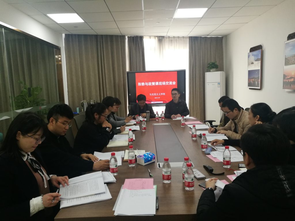 11月29日上午,为进一步贯彻落实教育部关于加强新时代高校“形势与政策”课建设的若干意见,总结前一阶段我校形势与政策课教学改革与创新的经验,马克思主义学院组织召开了“形势与政策"课建设现场交流会。参加会议的有各二级学院、宣传部、马学院的相关同志,会议由马学院副院长盛跃明主持。