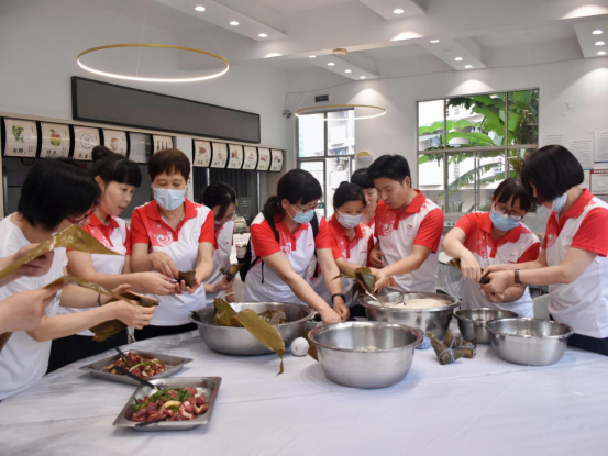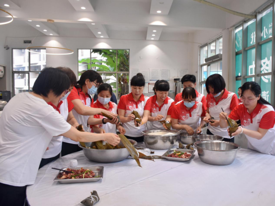 学院为大家准备好了材料,教工们围在一起,分工合作,一起动手包粽子,聊聊家常,交流工作,其乐融融。