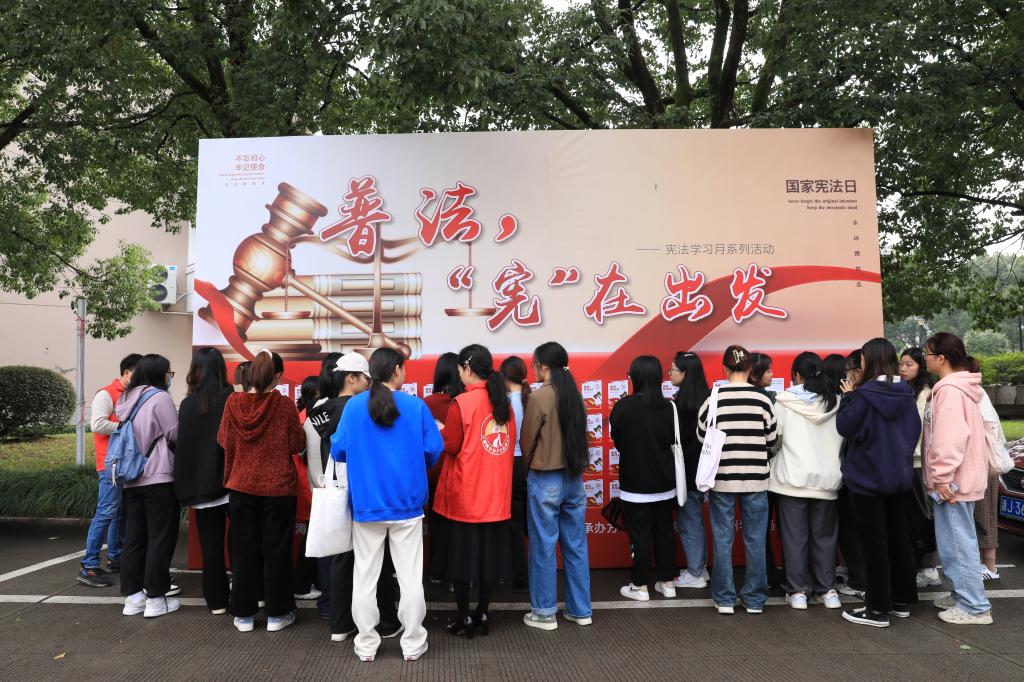 11月28日,法学社与临海市烟草局合办“普法,‘宪’在出发”活动。本次活动在喷绘墙上设置了一百道宪法知识竞答题,参加活动的同学可选任10题进行作答,正确率在80%以上即可获得精美礼品。路过的同学们均表现出浓厚的兴趣,纷纷参与到活动中,现场讨论的气氛十分激烈,临海市烟草局的工作人员不时在旁边讲解,同学们在活动中获益匪浅。
