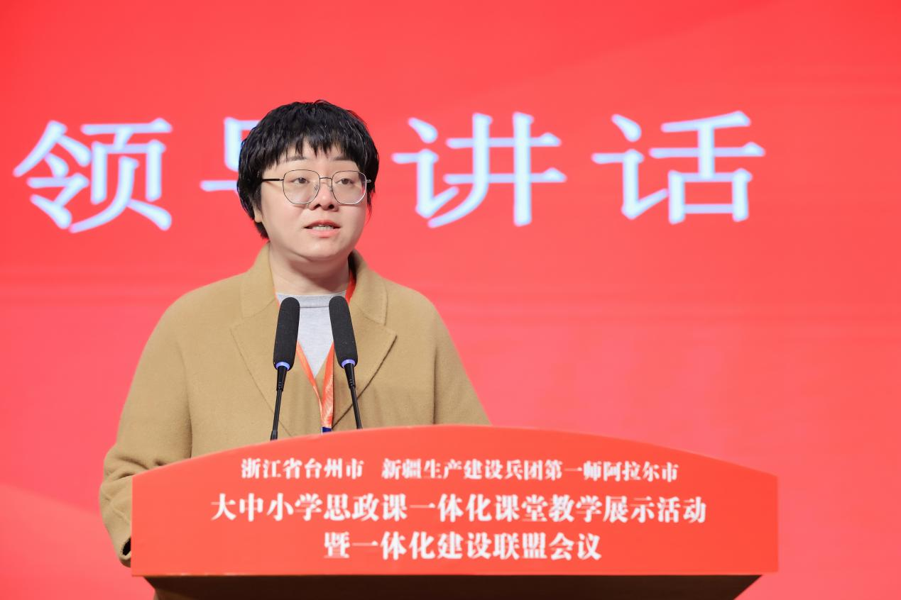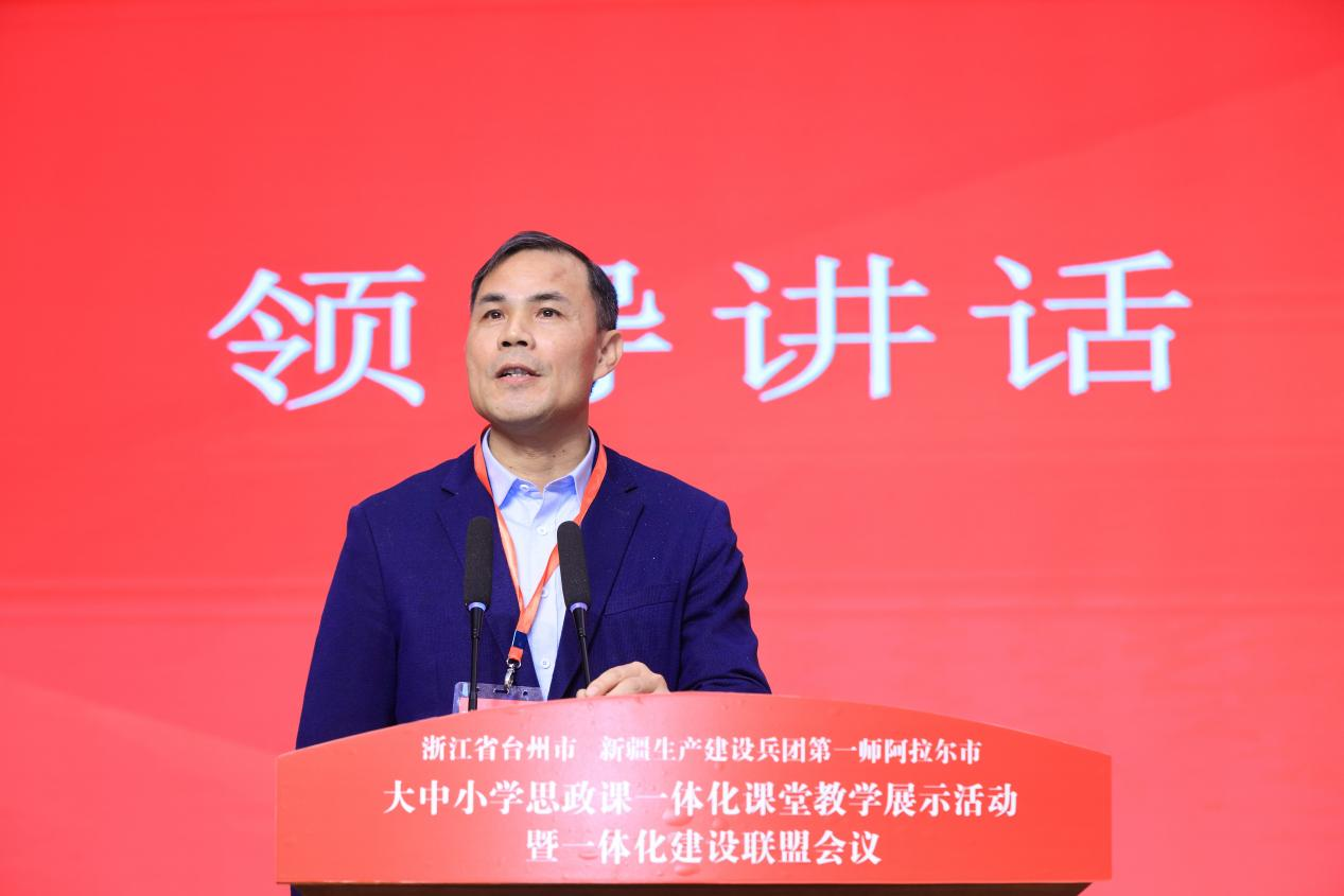 为了深入学习贯彻党的二十大精神,全面落实立德树人根本任务,在习近平总书记学校思想政治理论课教师座谈会上的重要讲话发表四周年之际,台州市委宣传部、台州市教育局与对口援疆城市——新疆生产建设兵团第一师阿拉尔市教育局联合主办的,台州市大中小学思政课一体化研究中心、台州市教育教学研究院、台州学院马克思主义学院、临海市中等职业技术学院、第一师阿拉尔市塔里木高级中学联合承办的“大中小学思政课一体化课堂教学展示活动暨一体化建设联盟会议”,于3月17-18日在台州市和阿拉尔市同时举行。会议采取线上线下同步进行的方式,来自台州市、阿拉尔市近300名专家学者和大中小学思政课教师、联盟学校校长、市县区教研员线下参加了会议,有上万人次在线点赞和留言。