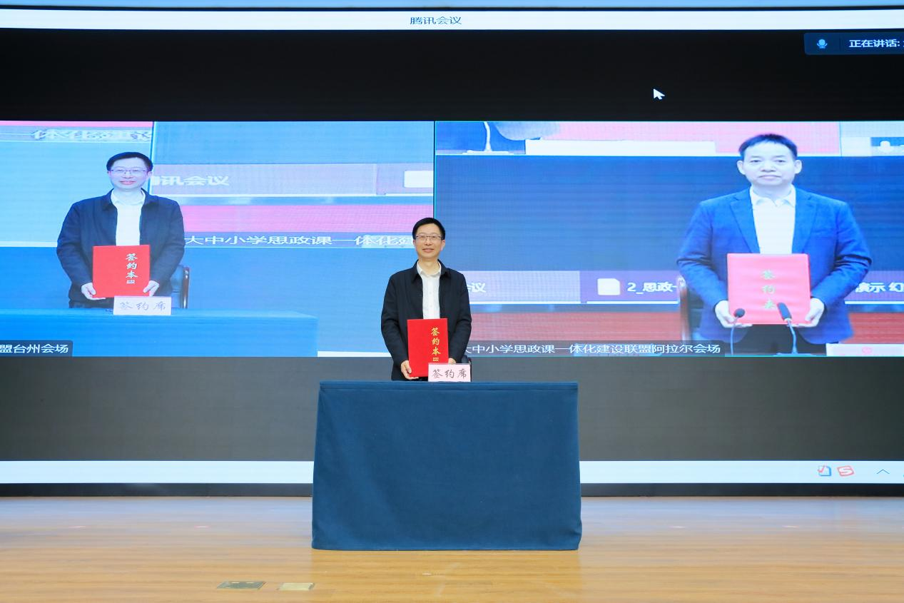 会议还举行了“浙江省台州市-新疆生产建设兵团第一师阿拉尔市大中小学思政课一体化建设东西部联盟”签约仪式、禁毒教育融入台州市大中小学思政课一体化建设启动仪式。