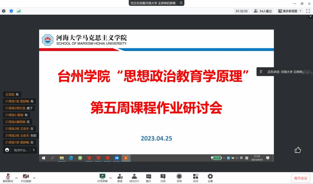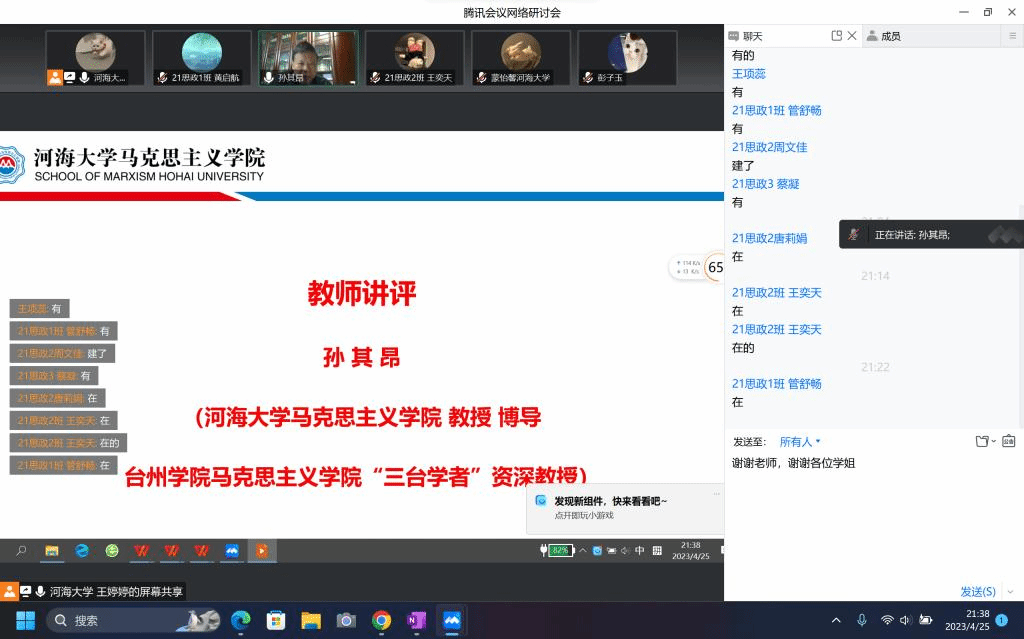 4月25日晚,马克思主义学院思想政治教育学原理课程组举办线上研讨会。课程主讲教师、我校“三台学者”资深教授、河海大学博士生导师孙其昂出席并指导。课程助教、河海大学思政专业博士生蒙怡馨、硕士生王婷婷、彭子玉列会并发言。思政专业47位学生参与了此次线上研讨会。