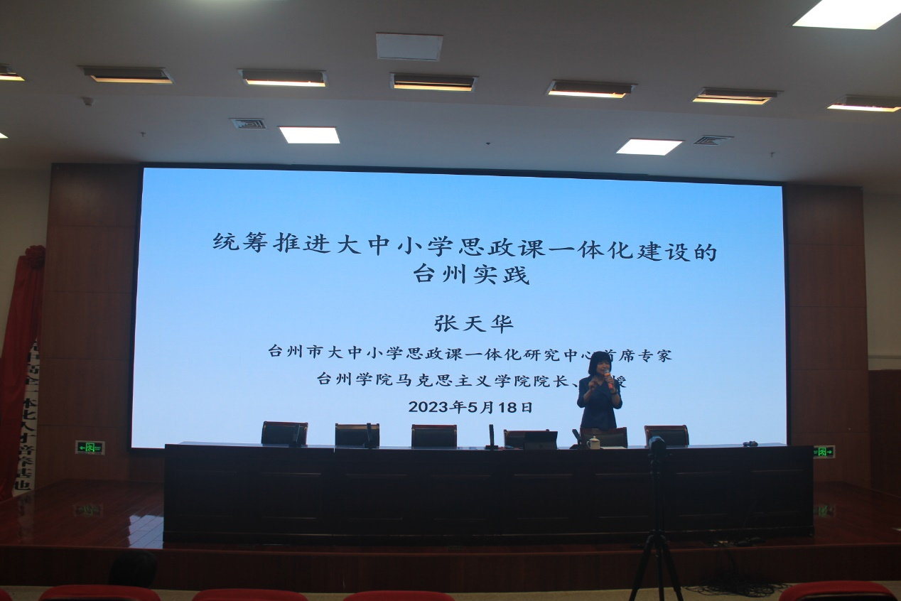 会上,张天华教授从国家、省市和县域层面就《统筹推进大中小学思政课一体化建设的台州实践》做主题报告,浙江省优秀思政课教师、禁毒教育宣讲团讲师杨宇琦为参会师生做禁毒教育宣讲。