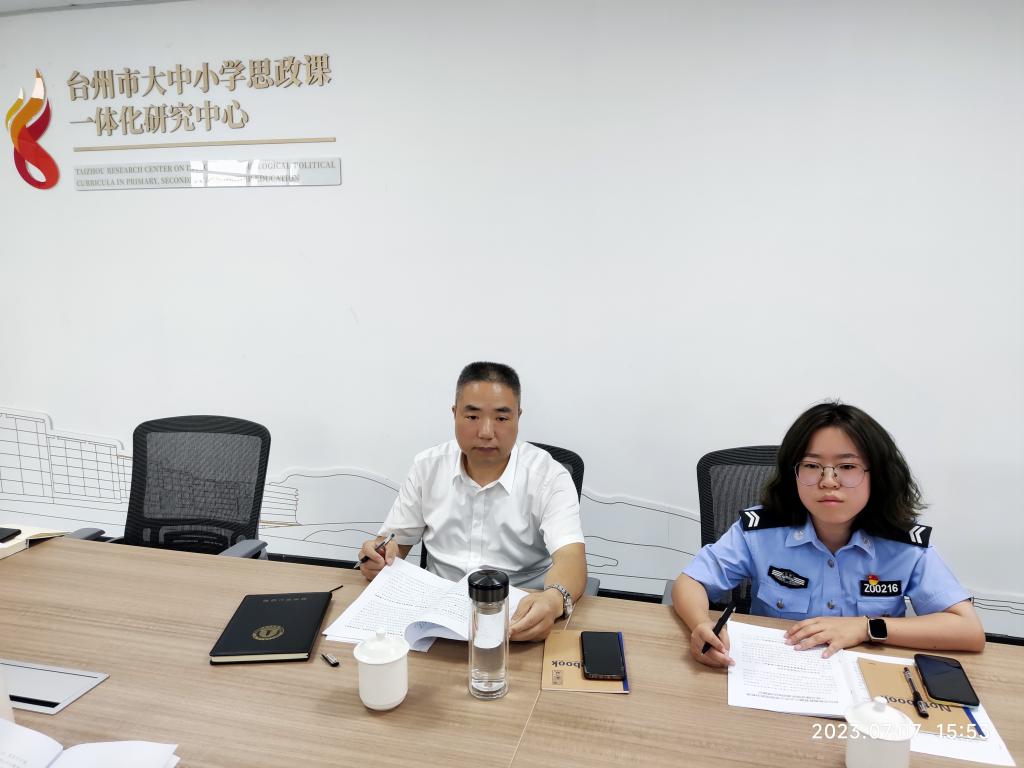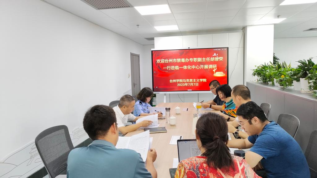 7月7日下午,台州市禁毒办专职副主任胡普荣和民警张宇斐来到台州市大中小学思政课一体化研究中心调研禁毒教育工作开展情况。中心首席专家、马克思主义学院院长张天华,中心副主任张礼强和禁毒教育讲师团成员参加了座谈。