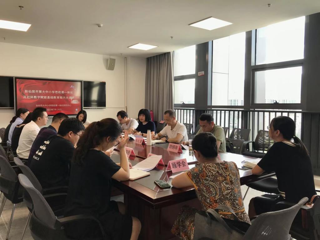 7月26日下午,研究中心团队成员与仙居县委宣传部常务副部长吴凯、县教育局李江军、县精神文明办郑佳颖、县委宣传部何兴、县教育局蒋益青、县司法局张鸿勋、县公安局吴雪芳、思政课教研员顾学会、仙居中学分管校长张灵侠、下各二中分管校长张燕翔、仙居一小分管校长陈薇薇等相关人员进行了座谈。