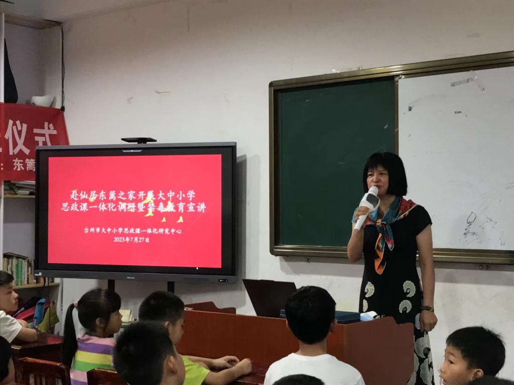 接着,浙江省高校优秀思政课教师、台州学院马克思主义学院杨宇琦老师给东篱之家留守儿童做了一场以“珍爱生命 远离毒品”为主题的禁毒宣传教育活动。教学活动中,杨宇琦老师利用制作精美的课件、欢快的语言为留守儿童讲解了毒品的种类、危害以及相关法律法规,使孩子们更深入地了解到什么是毒品,让他们直观地认识到毒品对个人、家庭和社会的严重危害。随后,通过讲述真实案例,教导他们如何识别、拒绝和防范各种形式的毒品诱惑,增强自我保护意识和能力,鼓励他们努力学习,早日成为祖国的栋梁。教学活动中间还设置了提问互动环节,准备了小礼物,激发了留守儿童的参与热情,提高了他们的禁毒认知。专门针对留守儿童群体开展禁毒教育宣讲,为大中小学思想政治教育地方创新实践提供了新的实践对象,为下一步针对特殊群体成功开展有针对性思想政治教育提供经验。