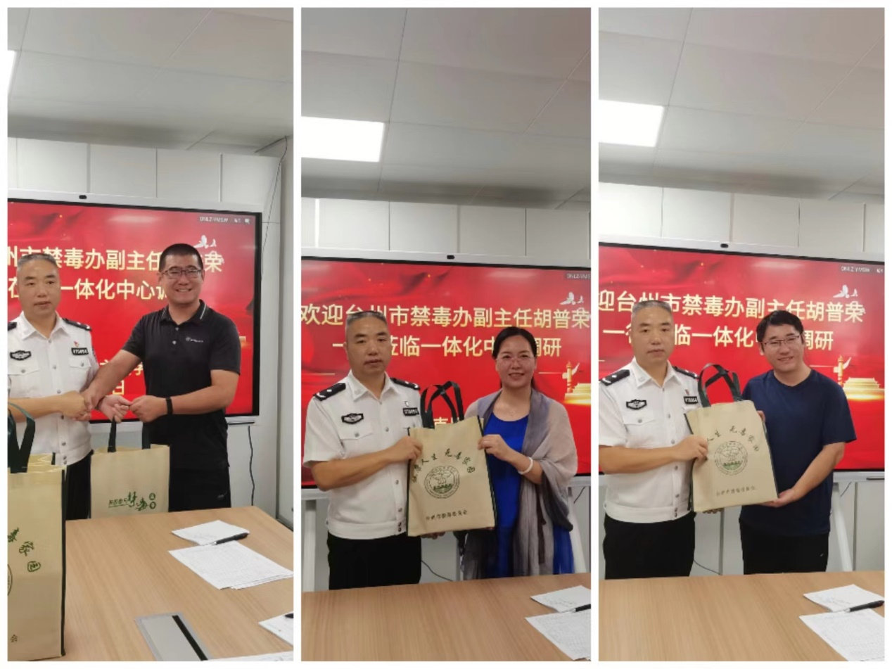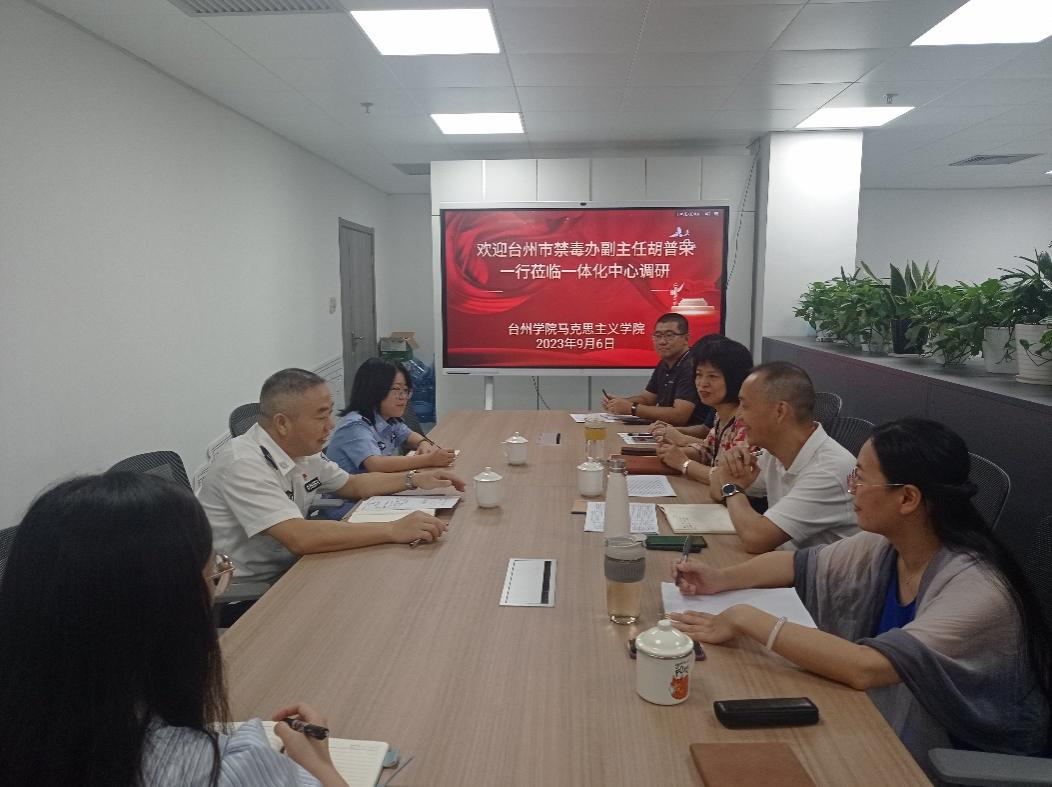9月6日,台州市禁毒办副主任胡普荣、民警张宇斐一行二人到台州市大中小学思政课一体化研究中心,就禁毒教育开展情况进行调研座谈。中心首席专家、马克思主义学院院长张天华,中心副主任张礼强和禁毒教育讲师团成员王在亮、李正军、王永力、杨宇琦、吕漫参加了座谈。