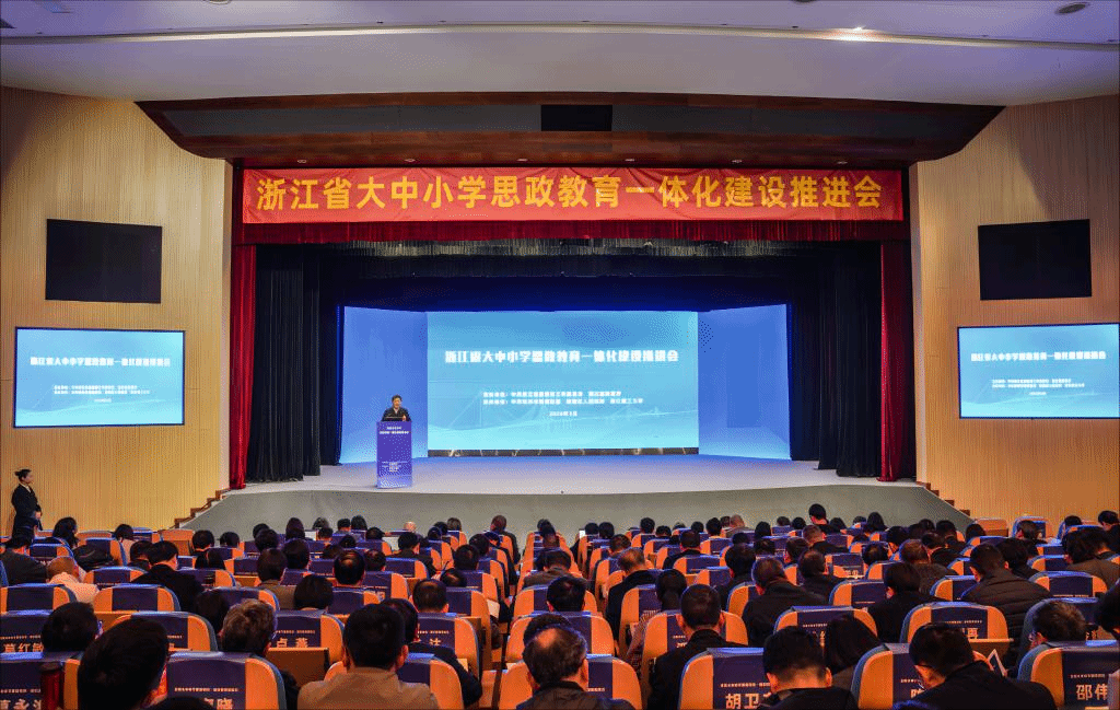 3月20日,浙江省大中小学思政教育一体化建设推进会在杭州市召开。会议旨在深入贯彻落实习近平总书记关于教育的重要论述和关于“大思政课”的重要指示批示,研究部署2024年全省大中小学思政教育一体化建设重点工作。省委教育工委副书记、省教育厅党组书记陈春雷出席会议并讲话。省委教育工委委员,省教育厅党组成员、副厅长陈峰主持会议。各地市教育局、全省大中小学思政教育一体化建设联盟理事会单位相关负责人、在杭高校、杭州市钱塘区思政课教师代表等参加会议。我校党委委员、宣传部部长蔡海江、马克思主义学院院长张天华参加本次会议。