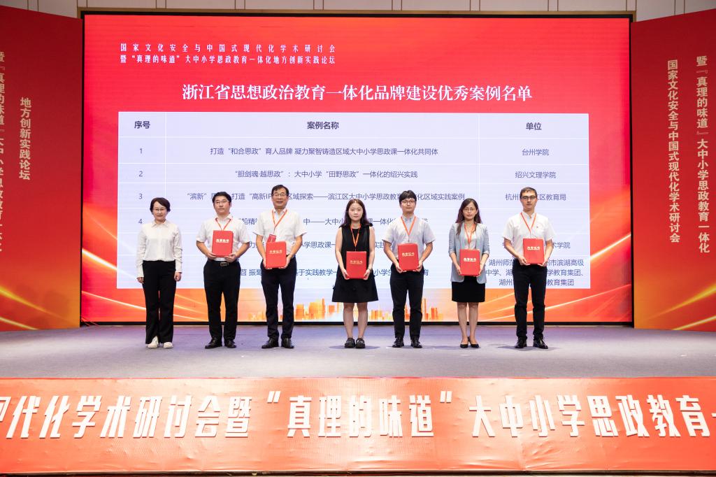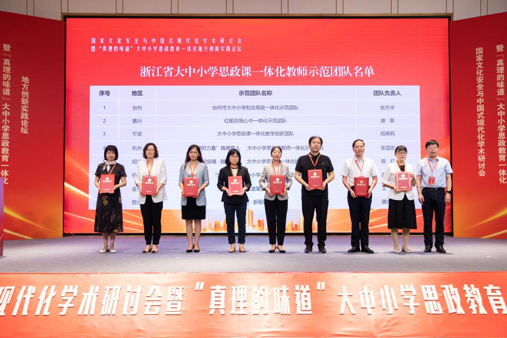 会议开幕式上公布的浙江省大中小学思政课一体化教师示范团队16个和思想政治教育一体化品牌建设优秀案例12个,我校均榜上有名。