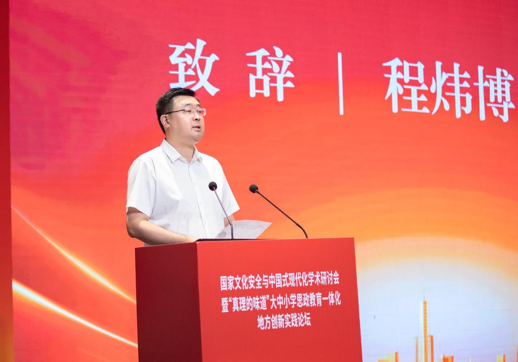 程炜博在致辞中指出,台州是一座有传承有信仰的城市和合圣地,台州还有着鲜明的红色根脉。深入推进大中小学思政教育一体化建设,是习近平总书记对于学校思政课建设作出的重要指示。台州一直以来高度重视大中小学思政教育一体化建设,在省内率先建立市域层面的一体化建设联盟和研究中心先行示范探索“和合思政”的市域品牌,积极打造台州标志性成果。此次活动不仅是一次学术交流的盛会,更是深入贯彻落实习近平总书记关于学校思政课建设重要指示精神的生动实践。希望台州学院和全市教育部门继续保持这一良好势头,进一步增强维护国家安全的责任感和使命,把国家安全贯穿到大中小学教育教学的全过程、全环节,持续优化思政课建设台州经验,加快走出一条具有台州特色的国家安全道路;希望各位专家老师持续关心支持,为台州学校思政教育一体化建言献策,为促进国家文化安全发展,推进中国式现代化注入创新活力和蓬勃动力。