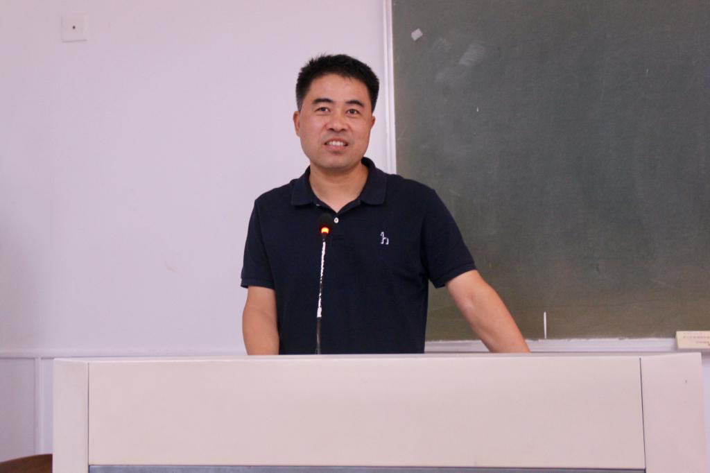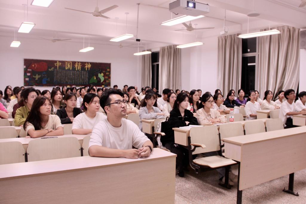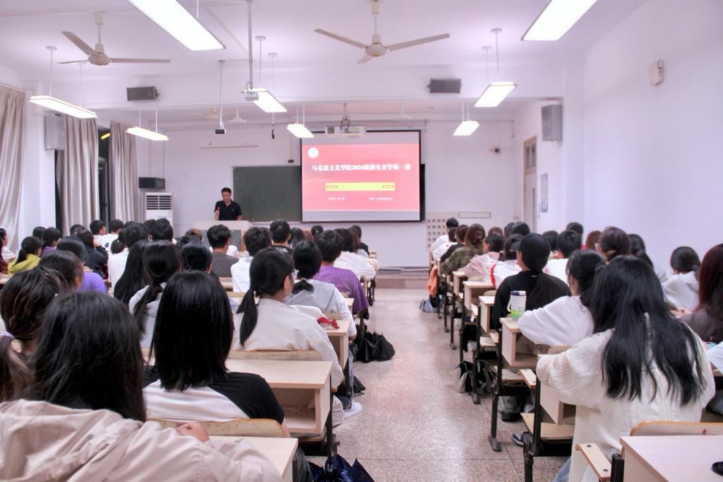 9月24日,马克思主义学院党总支书记王胜在1210教室面向2024级全体新生讲授“开学第一课”,勉励同学们奋力书写为中国式现代化挺膺担当的青春篇章。