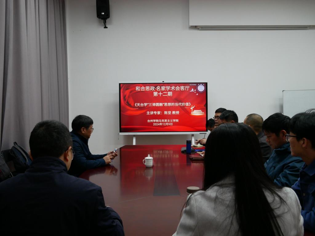 12月9号下午,马克思主义学院成功举办第十二期“和合思政·名家学术会客厅”学术交流活动。山东大学资深教授陈坚做题为《天台学“三谛圆融”思想的当代价值》的学术讲座。学院党总支书记王胜主持本次报告会,学院相关学科背景博士和部分办公室人员参加交流。