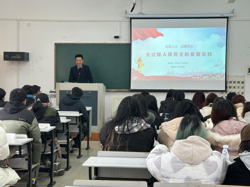 今年是全国人民代表大会制度建立70周年,颜邦林结合70年来全国人民代表大会工作取得的历史性成就,在讲述马克思主义经典作家关于社会主义民主的重要思想基础上,重点引导学生们学习了习近平总书记关于全过程人民民主的重要论述,详细讲述了台州市人大践行全过程人民民主的典型实践,使同学们对全过程人民民主有更为直观的认知、更加深刻的理解。课程最后,颜邦林鼓励同学们做全过程人民民主的积极宣传者、参与者,欢迎同学们利用课余时间深入台州市人大代表联络站,“零距离”感受人民代表大会制度魅力。