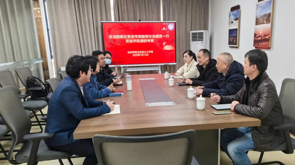 张天华院长对池德胜一行的到来表示欢迎,重点从师资力量、科研实力、校地合作成效、特色工作等方面介绍了学院概况,希望能够力所能及地为路桥区提供更多帮助和支持。池德胜副部长感谢马克思主义学院对路桥区委宣传部过往工作的支持,期望依托学院的高水平师资力量,共同建立高水平研究平台。双方经过讨论后初步达成共识,围绕路桥商贸文化、十里长街历史文化街区与习近平文化思想等重要主题,在高水平理论文章撰写、高质量资政报告撰写、省部级以上课题申报等方面实现资源共享、优势互补、互利共赢、共同发展。