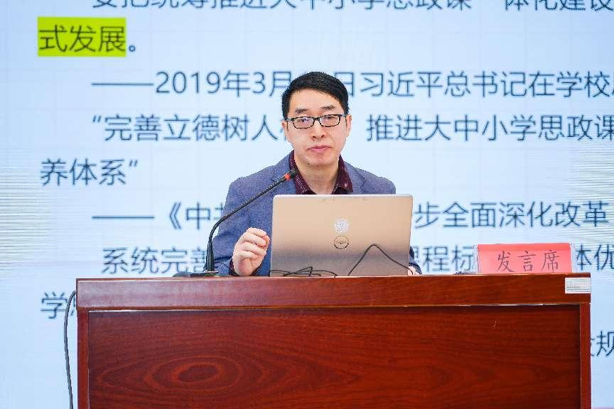 王国芳做了题为“大中小学思政课一体化建设中的教研力量”的学术报告。王国芳从重视教研的力量、以教研赋能大中小学思政课一体化建设、提升思政课教研员的核心素养三个方面,分析了大中小学思政课一体化建设中的教研力量,王老师提出课堂教学是思政课一体化建设的“最后一公里”,需强化教研协同,围绕课程目标、课程内容、课程实施和课程评价,优化顶层设计创新基层实践,实现各学段纵向衔接、螺旋上升,推动课程内涵式发展的过程,全面提升思政育人实效。