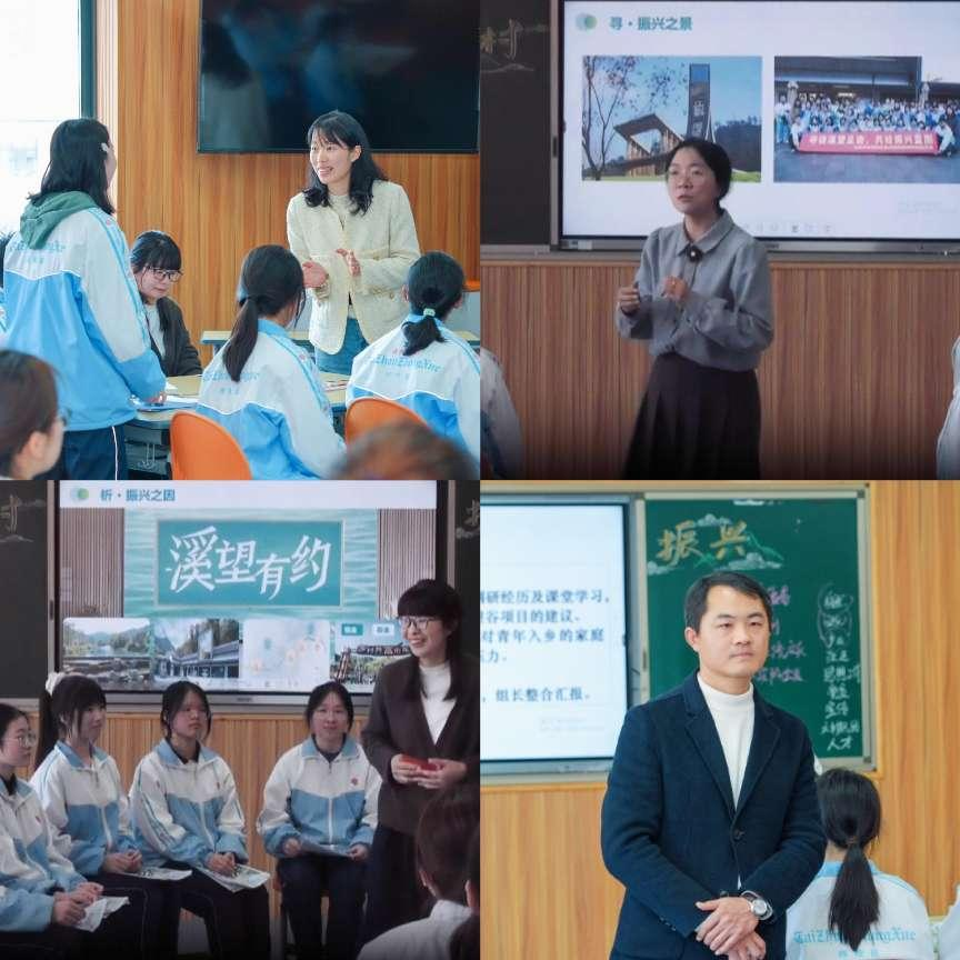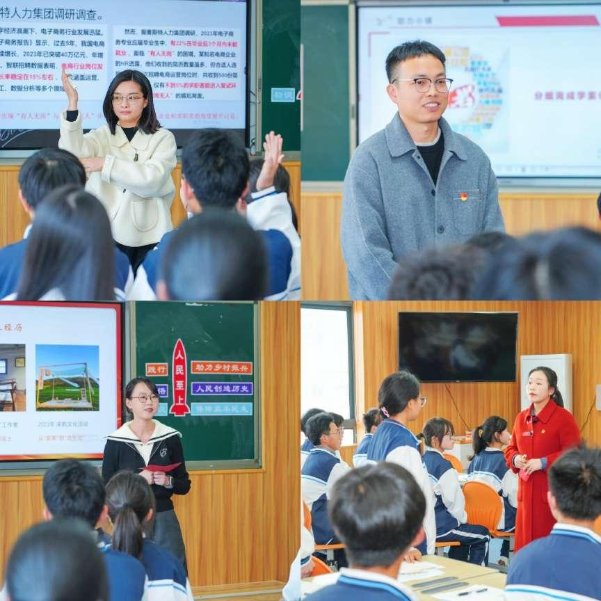 在高中职高组的展示环节中,我们看到了来自不同学校的教师团队所展示的精彩案例。孙夏艳、陈雅琴、项笑笑、王永力四位教师共同呈现了《从乡村振兴规划看希望的田野》这一课题。他们以临海江南溪望谷为样本,在课前调研的基础上,从“看振兴之景、析振兴之因、绘希望之野”三个篇章展开,通过深入浅出的方式,将乡村振兴规划与现实生活紧密结合,将高中知识与大学知识深度串联,通过访谈、汇报、情景剧、小组讨论等形式充分调动学生参与热情,引导学生理解国家发展战略,激发他们对农村发展的关注和热情。而黄岩一职校尤贝羽、王赛、项伟与台科院徐含默四位教师则围绕《要坚持人民至上 扎实推进共同富裕》这一课题,紧扣“民生保障—历史创造—乡村振兴—国之大者”逻辑主线,通过理论具象化、实践场景化、价值行动化的设计策略,将模具制造、电商运营等专业技能与“人民至上”理论深度融合,破解思政课“悬浮化”困境;活用台州民营经济、大陈岛垦荒精神等在地资源,结合东西部职教协作等跨域实践,形成本土特色与全局视野并重的育人格局,最终形成“专业思政双螺旋、校地协同生态圈、知行进阶培养链”三位一体的职教思政创新范式。
