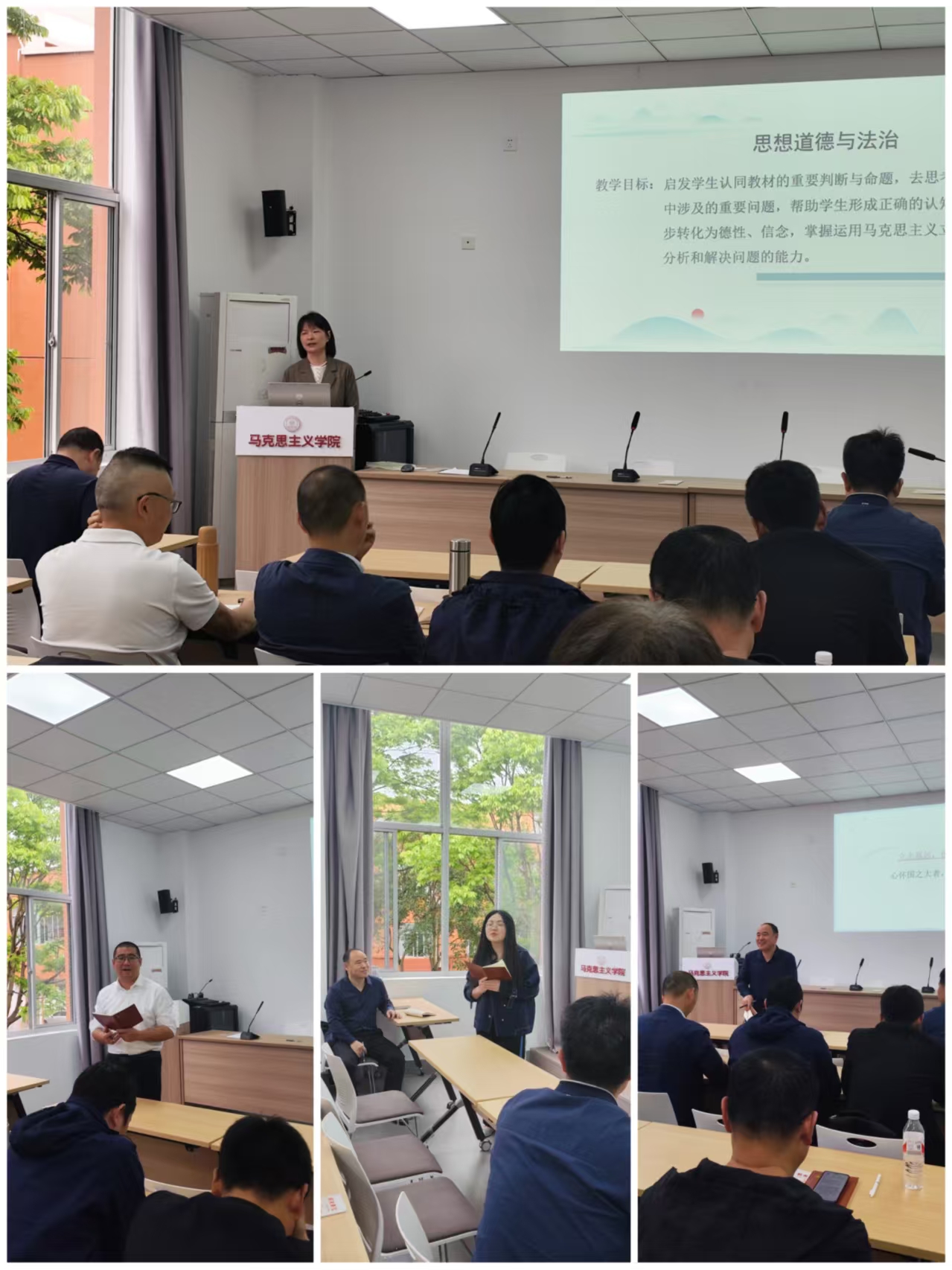 活动特邀马学院思想道德与法治课程资深教师贺俊燕进行该课第二章"追求远大理想 坚定崇高信念"的示范教学。授课教师通过分析教材的逻辑体系,精心设计课程导入、预设、生成各环节;运用丰富的典型、鲜明、能打动人的案例,设计问题链,启发学生进行思考;同时,钻研教材,有效突破难点,与学生开展对话式教学,把思政课融入到生活中,延伸到课堂外,有效实现了思政课价值引领与情感共鸣的有机统一。