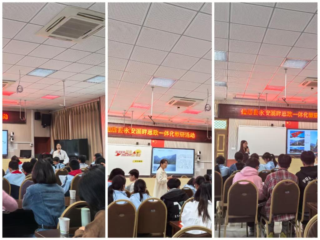 张天华教授现场观摩了仙居县小学、初中、高中不同学段三位优秀思政课教师的示范教学,听取了安岭乡中心学校张云泉书记、仙居县白塔中学顾妮恒书记分享的《乡土文化深植思政教育的校域实践》《永安溪畔的思政一体化》的实践经验,并为仙居县中小学思政课骨干教师作了主题为“推进大中小学和合思政一体化建设的地方实践”的专题报告。首先,张天华教授对大中小学思政课一体化的基础理论、教学评价和台州实践进行了系统阐释,重点阐释了大中小学和合思政的内涵,分析了和合思政的发展指数、地方创新实践和经验启示,提出了加强“真理的味道·和合思政”品牌建设和区域协同、创新评价体系、融合地方特色等观点。其次,张天华教授对三位不同学段的思政课老师的现场教学示范课表示肯定,认为三位老师都能够结合不同学段学生的认知特点,充分挖掘地方文化思政元素,有效运用特色教学方法,积极调动了学生的积极性,是一堂好的思政示范课。最后,张天华教授对仙居县近年来积极打造的“永安溪畔思政”的县域品牌表示肯定,表示将会进一步发挥台州学院马克思主义学院的引领示范作用,在打造台州特色联盟校模式中,下一步会将校地合作、校校合作更多地伸向仙居这片充满思政教育活力的土地,共同推动建设“真理的味道·和合思政·永安溪畔思政”的省市县一体化品牌矩阵。