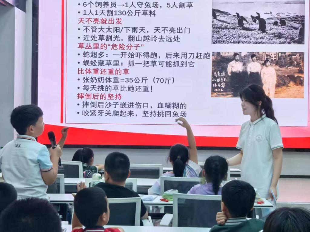 参观结束后,实践队员们为中心内的学生们带来了一场主题为“闪闪发光的大陈岛精神”的宣讲。宣讲紧扣“艰苦创业、奋发图强、无私奉献、开拓创新”这十六字垦荒精神内核,同时深情讲述了张菊莲和陈显坤两位垦荒英雄的感人故事,同学们积极互动现场气氛热烈。