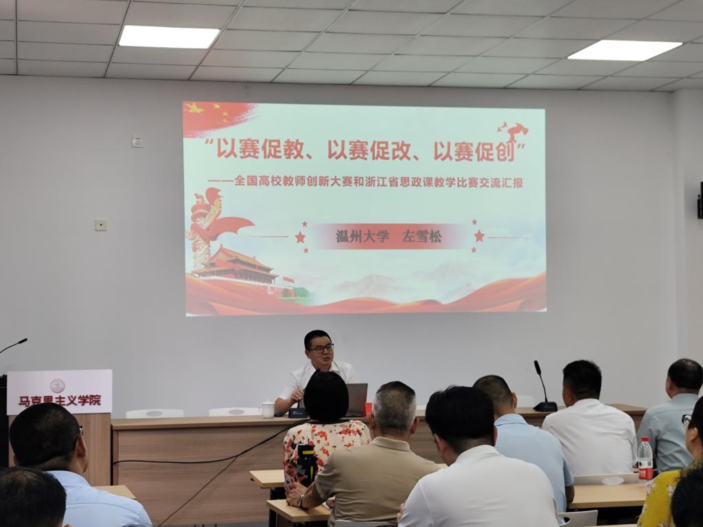 2025年9月6日下午,马克思主义学院第四期思政教学微论坛如期举办。论坛特邀全国高校第五届教师教学创新大赛二等奖获得者、温州大学马克思主义学院左雪松教授作“以赛促教、以赛促改、以赛促创”主题分享,学院党政领导、全体思政课教师认真聆听了报告。