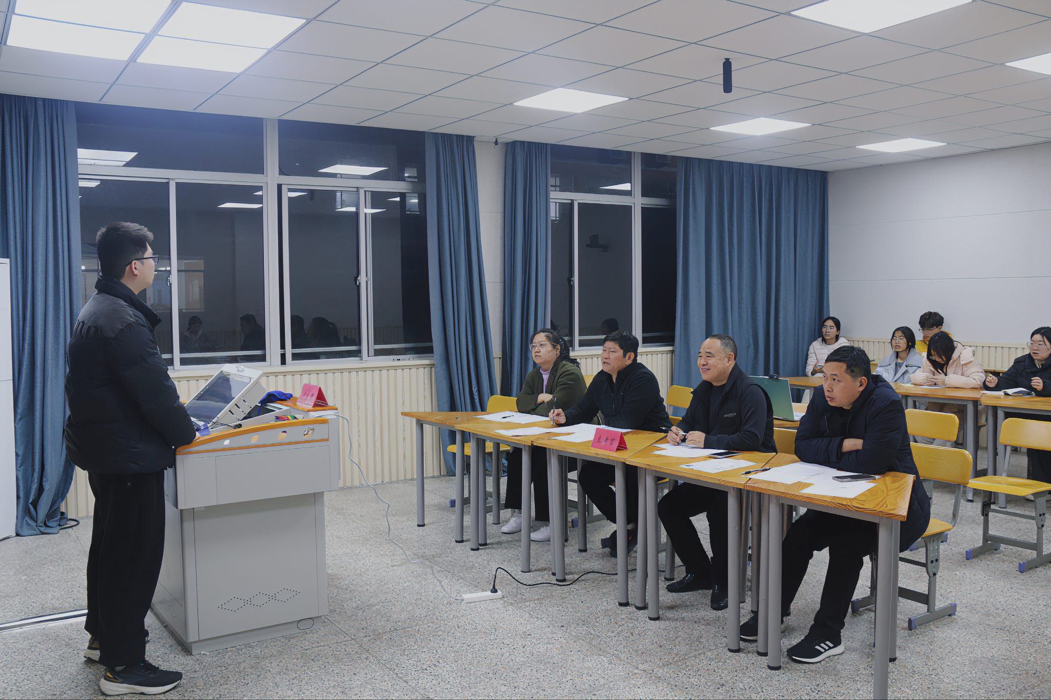 本次模拟面试严格参照高校研究生复试标准开展,特邀学院副院长李跃华、党总支副书记徐培林,专任教师彭志恩、向昊秋、赵轩组成评委团,设置外文自我介绍、专业问答、综合素质考察三大核心环节,全程还原真实考场场景,让考生沉浸式感受复试氛围、适应考试节奏。
