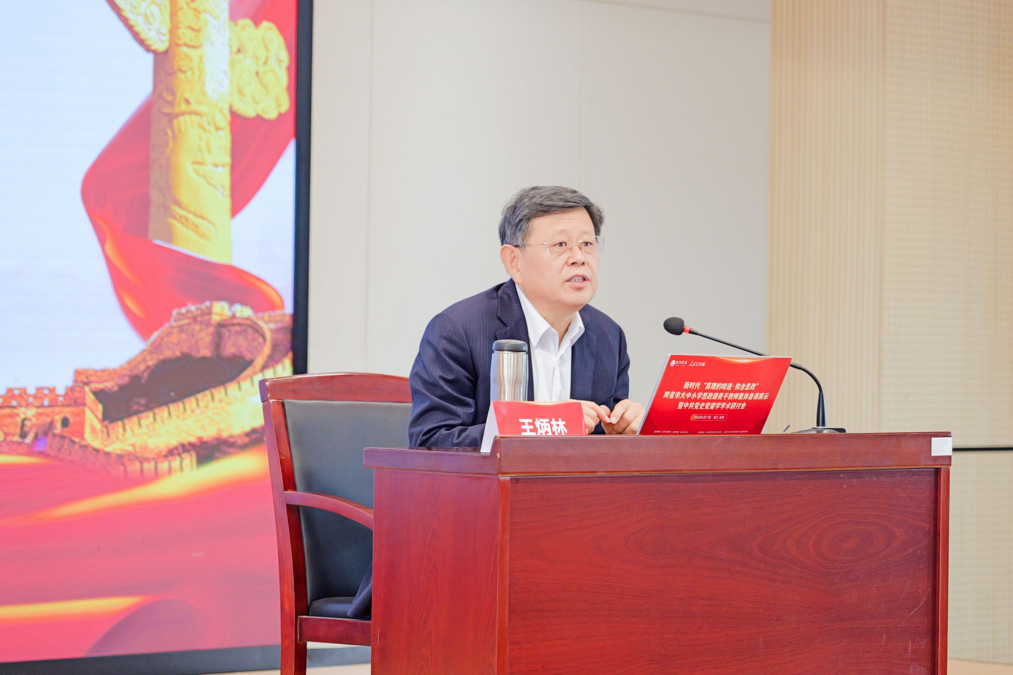 王炳林院长以“弘扬红色文化、赓续精神谱系”为主题,系统阐释红色文化在新时代思政教育中的独特育人功能与时代价值。他从历史维度、理论维度、实践维度深入剖析,全面梳理中国共产党人精神谱系的丰富内涵、发展脉络与精神实质,精准阐释其融入大中小学思政课的核心要义、实施路径与关键环节。王炳林教授强调,红色文化是思政教育最鲜活、最厚重的宝贵资源,必须坚持守正创新、贯通融入,切实发挥红色文化铸魂育人的重要作用,引导广大青少年学生深刻感悟百年党史的精神力量,坚定理想信念、厚植爱国情怀、砥砺责任担当,真正让革命精神代代相传、薪火永续,在新时代焕发新的生机与活力。
