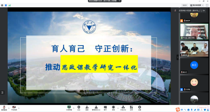 与会人员收看了中国社科院马克思主义研究院党委书记辛向阳教授关于《习近平谈治国理政》第四卷的学习辅导报告,辛教授的报告解读深入,说理明晰,为把握全书精神脉络,读懂用好最新理论成果提供重要指导;聆听了浙江大学马克思主义学院副院长代玉启教授题为“推动思政课教学研究一体化”的专题报告,报告以思想道德与法治课为例,系统介绍了浙江大学思想政治理论课改革的 “四位一体”的整体性教学改革方案和实践经验,全面分享了教学研究一体化的真知灼见,干货满满,启发性强,为我们深入思政课教学研究提供了方向和思路。